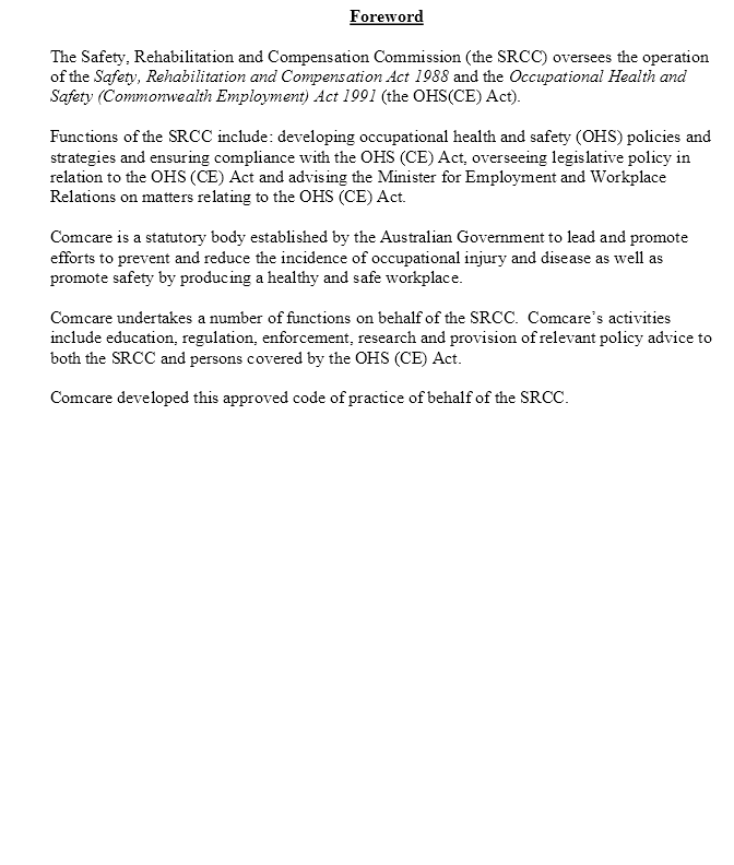 An approved code of practice is a source of expert practical information about safe work practices in specific circumstances. Detailed obligations are contained in the Occupational Health and Safety (Commonwealth Employment) (National Standards) Regulations 1994 (the regulations). Where there are any inconsistencies between the code and the regulations, the regulations will apply.