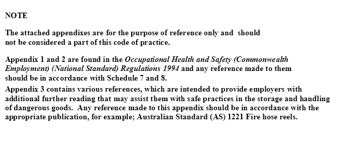 The interpretations contained in the following legislation apply in this Approved Code of Practice for the Storage and Handling of Dangerous Goods in Commonwealth employment:
