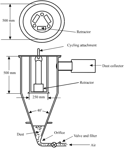 7.6.3.1 The retractor shall be positioned in a test chamber as described in annex 5 to this Regulation. It shall be mounted in an orientation similar to that in which it is mounted in the vehicle. The test chamber shall contain dust as specified in paragraph 7.6.3.2 below. A length of 500 mm of the strap shall be extracted from the retractor and kept extracted, except that it shall be subjected to ten complete cycles of retraction and withdrawal within one or two minutes after each agitation of the dust. For a period of five hours, the dust shall be agitated every twenty minutes for five seconds by compressed air free of oil and moisture at a gauge pressure of 5.5 x 105 + 0.5 x 105 Pa entering through an orifice, 1.5 ± 0.1 mm in diameter.